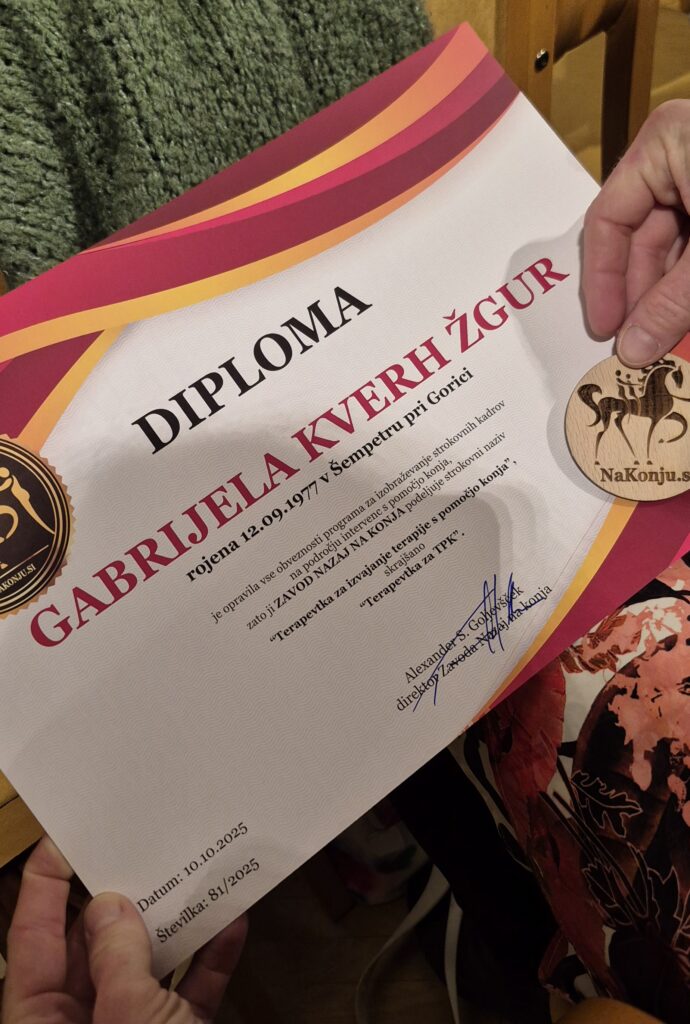 Ob zaključku izobraževanja je mag. Gabrijela Kverh Žgur, specialna in rehabilitacijska pedagoginja prejela diplomo in strokovni naziv terapevt za izvajanje terapij s pomočjo konja.
